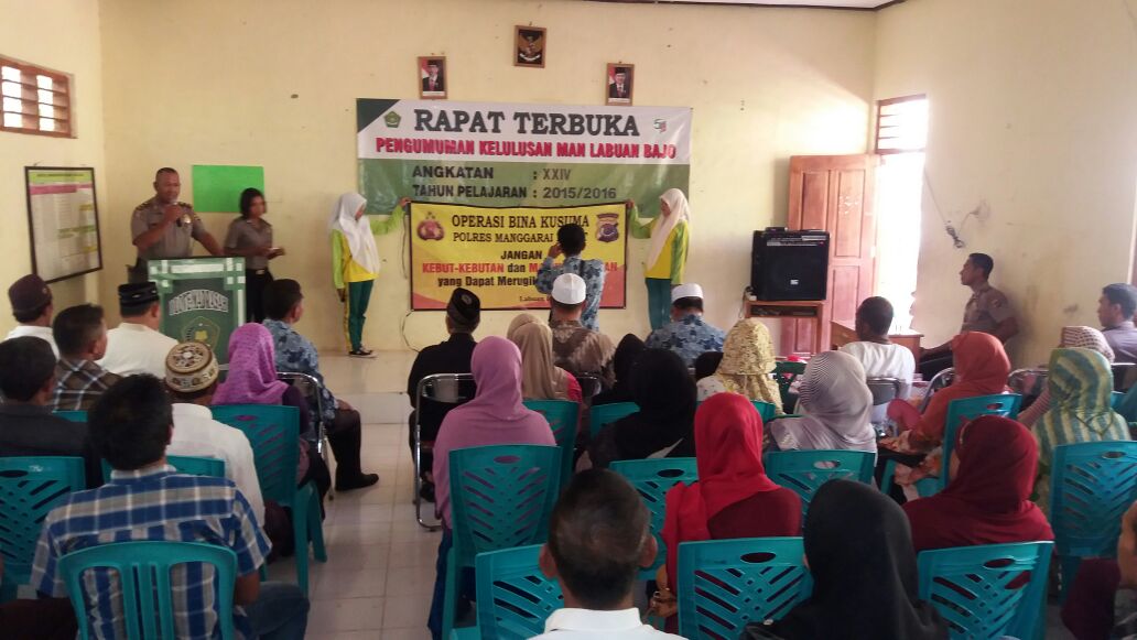 Tribratanewsmanggaraibarat.com - Kepoisian Resor Manggarai Barat, Nusa Tenggara Timur melalui satgas II Operasi Bina Kusuma Turangga 2016, melaksanakan pembinaan dan pen yuluhan tentang kenakalan remaja kepada para pelaja Madrasah Aliyah Negeri Labuan Bajo, Rabu (11/5/16), pagi tadi.